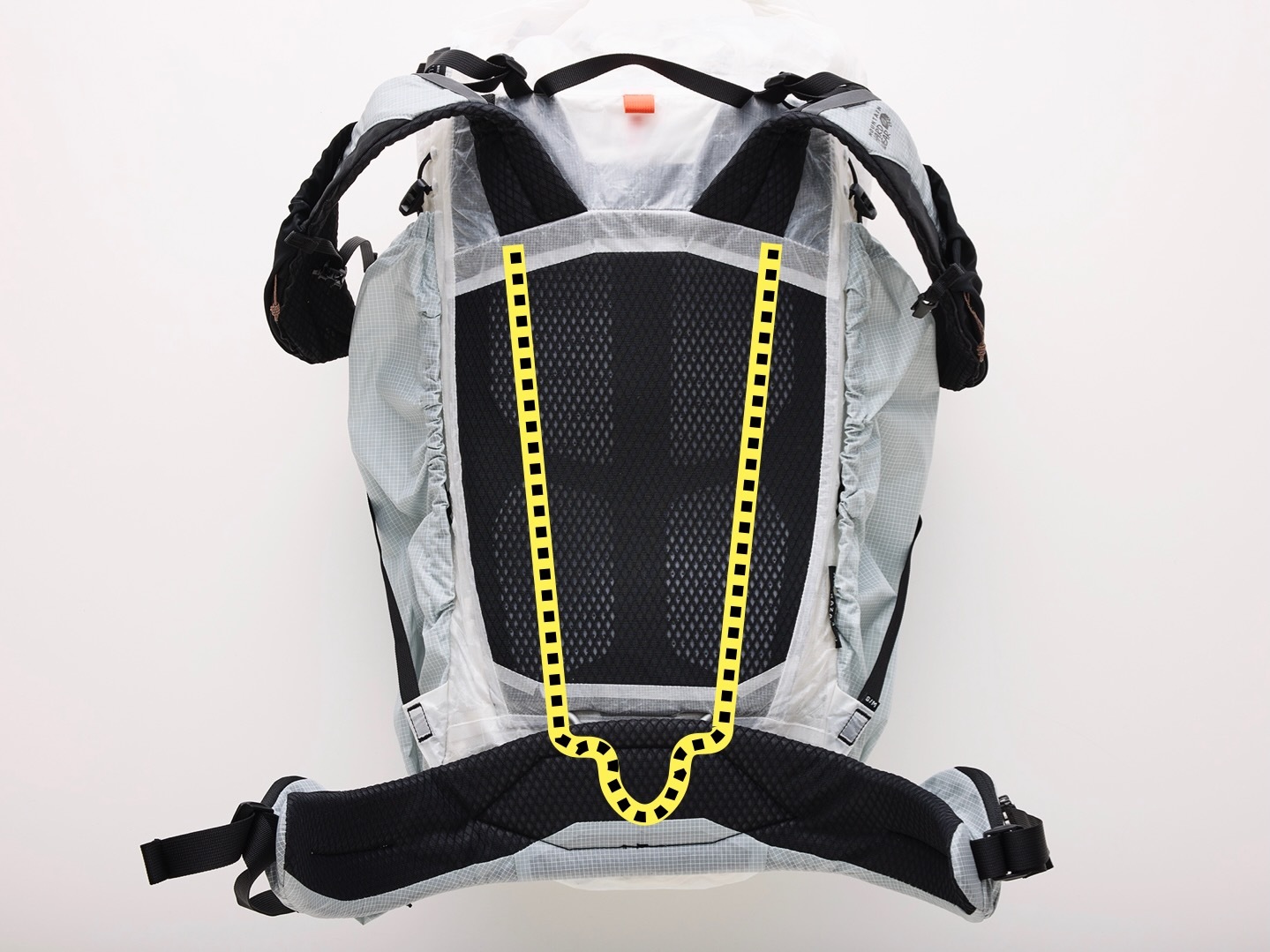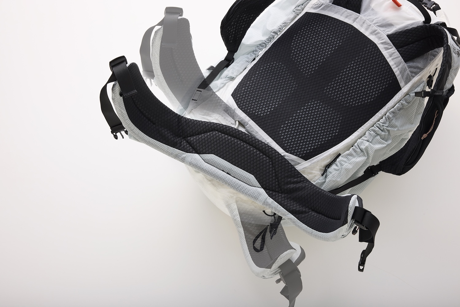 背面のサスペンション構造や可動式ヒップベルトは、これまでエクスペディション用の大型ザックで実績のあるシステムを活かし、より軽さと通気性を持たせた形に仕上げられています。しっかりとしたフレームのバックパネルとサスペンションシステムを備えているので、従来のバックパックと同じような感覚で背負えるULバックパックということができそうです。