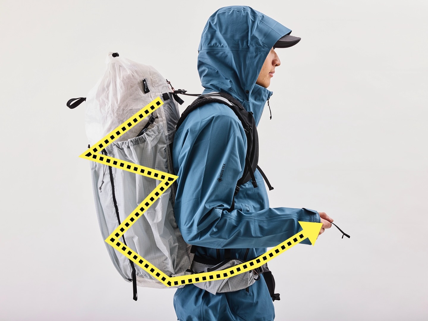 サイドのコードを引くと、側面にジグザグに入ったコンプレッションストラップ全体が連動。ワンアクションで荷物全体を圧縮できます。背負ったまま調整できることもポイントです。荷物がコンパクトになるだけでなく、背中側に荷重をギュッと引き寄せながらフィットさせられるため、歩行時の安定感が高まります。
