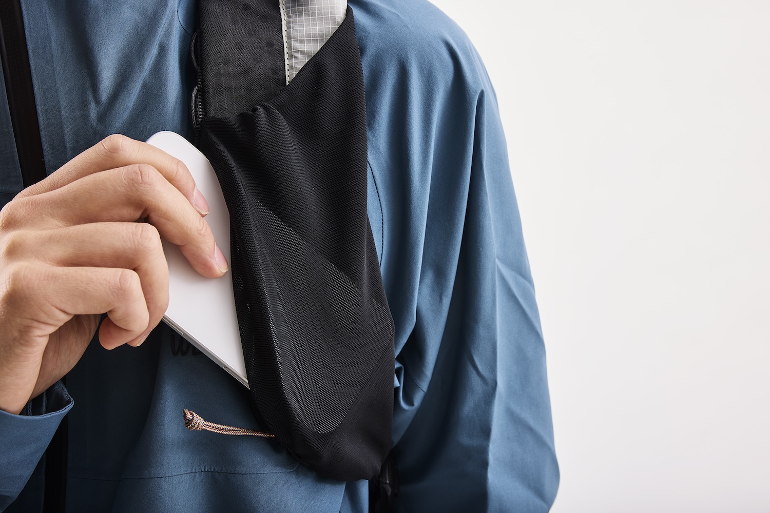 「左右のフロントハーネスに備えた大型ポケットも使い勝手がよくて気に入っています。スマホやソフトフラスク、地図なども入るサイズなので、休憩のたびに荷物を下ろす手間がありません。ドロップインポケットとは別にジッパー付きのポケットがあって、スマホなどが落ちないのも地味に便利。