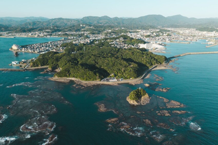 フィールドワークを行った天神崎。対岸には南紀白浜の街並みと連なる山々を臨める
