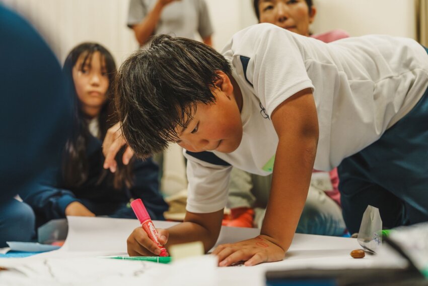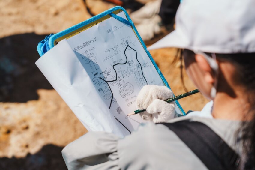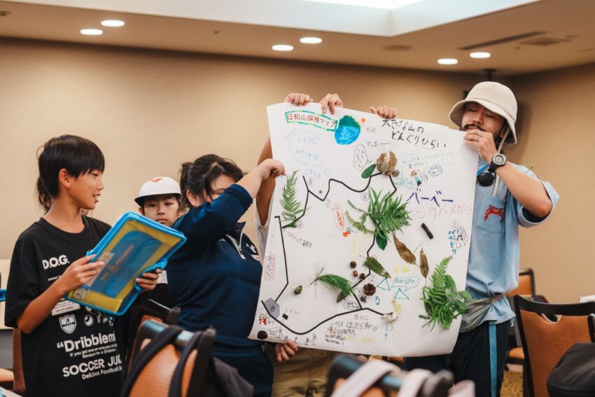 子どもたちは事前の座学で地域の山林について学習をした上でフィールドに出る。手元にはその日のミッションとおおまかなマップが挟まれたバインダー。それぞれのポイントで見つけたものを拾い上げ、感じたことなどを書き出し、最終的には模造紙でグループごとの手書き地図を作り上げていく。