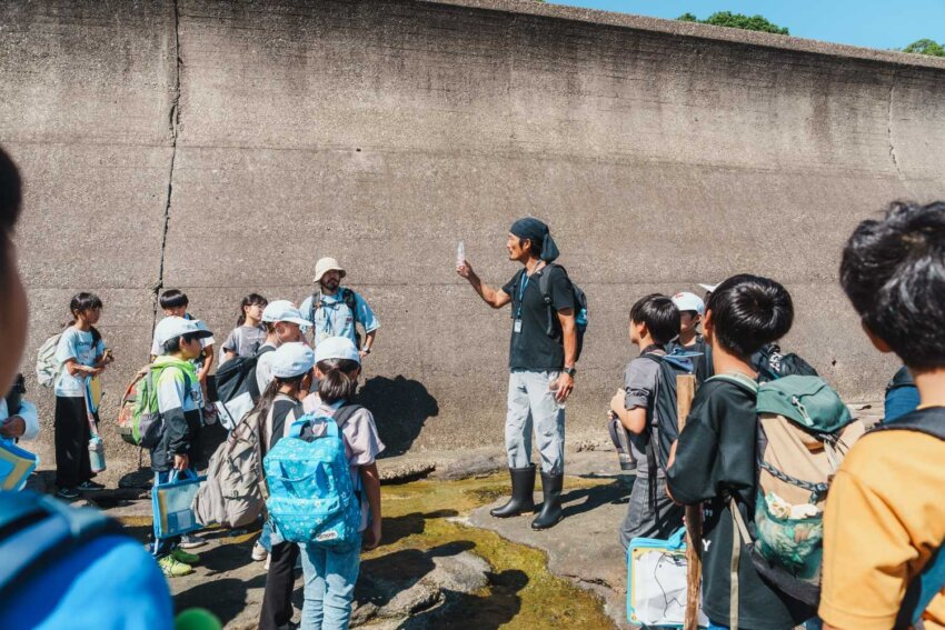 フィールドワークの最後には、岩礁付近の岩壁で立ち止まり、改めて「山と海の循環」についての解説が行われた。ここでは森に蓄積された雨水が岩壁の隙間から流れ出し、磯を通じ海へと運ばれていく様子を直接目にすることができる。天神崎は、生態系のあり方を目の当たりにすることができるという意味でも貴重なスポットなのだ。