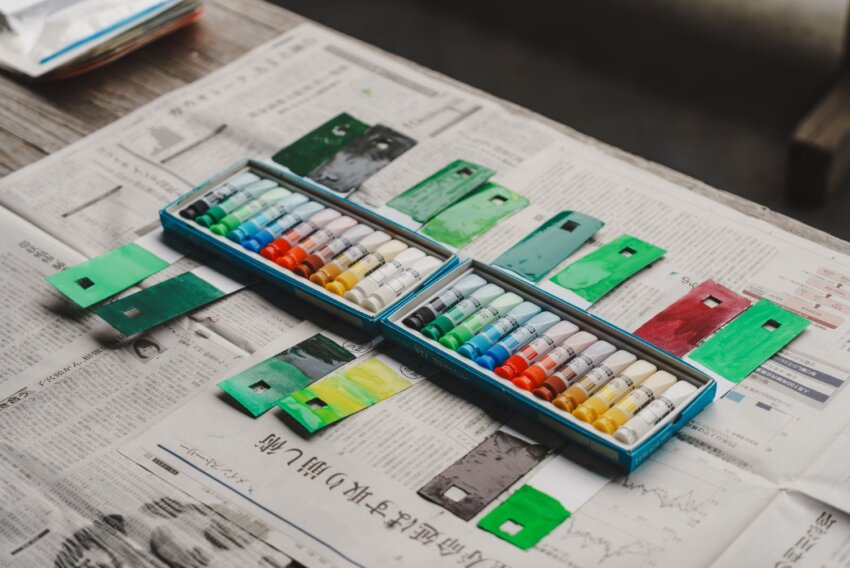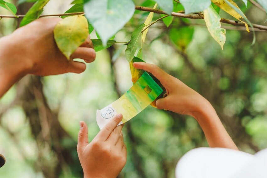 子どもたちが準備していたのは、行き先のマップと、予め絵具で自由に作った「自分の色」。様々なものに触れて観察しながら自然の中にある「自分の色」を探していくのだという。
