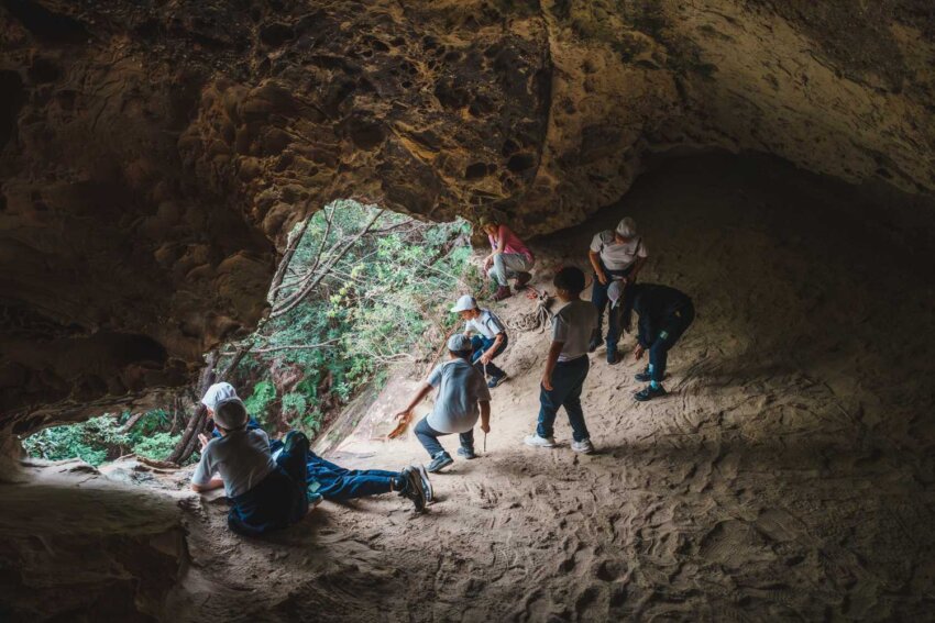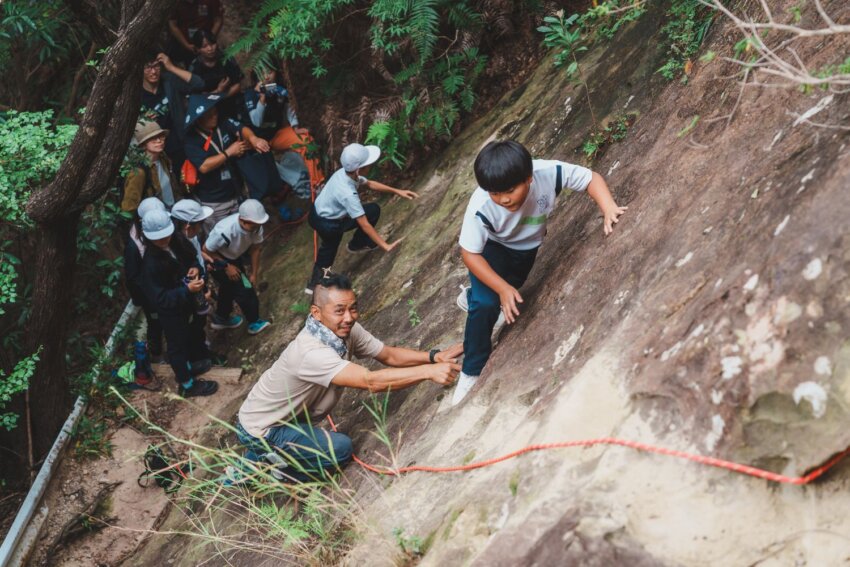 途中、おそるおそる砂岩の斜面をよじ登って洞窟を体験。声をかけあいながら、石壁の感覚を確かめて精一杯手足を伸ばすプチアドベンチャーだ。