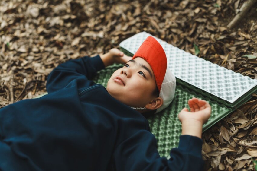終盤にはじっくり自然を感じる時間も設けられている。ハンモックで揺られてみたり、落ち葉が広がる地面にマットを敷いて寝そべり、深呼吸してみたり。わいわいと騒いでいた子どもたちがしんと静まり返って、風の音だけが響き渡り、自然に体を預ける。本当、山で寝転ぶのって気持ちいいんだよなぁ、そんなことを想いながら横に並んで目をつむる。