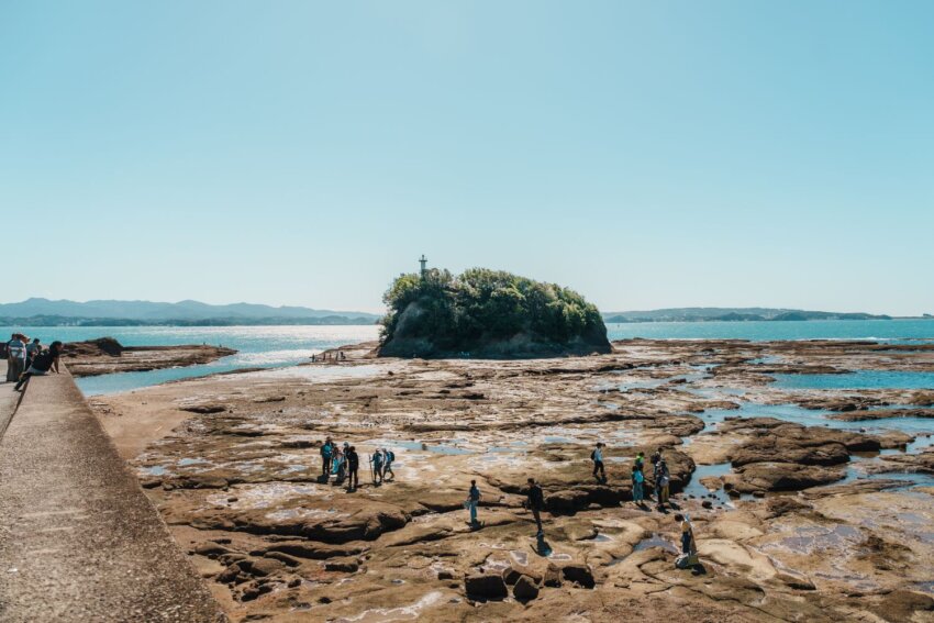 傾きかけた陽が反射し海面がキラキラと、まぶしいくらいに強く輝く。潮が引いた岩礁では子どもも大人も時間を忘れて大はしゃぎしながら水の中を覗き込み、木の枝で作った釣竿を片手にエビやカニを探すのに夢中になっている。
